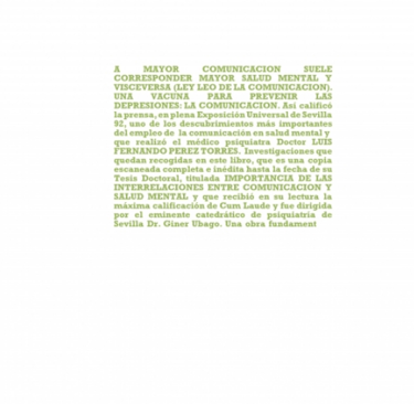 A MAYOR COMUNICACIÓN SUELE CORRESPONDER MAYOR SALUD MENTAL ,Y VISCEVERSA (LEY LEO DE LA COMUNICACIÓN).LA COMUNICACIÓN SE COMPORTA COMO UNA ESPECIE DE VACUNA MENTAL,PSICOVACUNA PARA PREVENIR Y MEJORAR MUCHAS VECES LAS DEPRESIONES:.Así calificó la prensa, en plena Exposición Universal de Sevilla 92, uno de los descubrimientos más importantes del empleo de la comunicación en salud mental y que realizó el médico psiquiatra Doctor LUIS FERNANDO PEREZ TORRES. Investigaciones que quedan recogidas en este libro, que es una copia escaneada completa e inédita hasta la fecha de su Tesis Doctoral, titulada IMPORTANCIA DE LAS INTERRELACIONES ENTRE COMUNICACIÓN Y SALUD MENTAL y que recibió en su lectura la máxima calificación de Cum Laude y fue dirigida por el eminente catedrático de psiquiatría de Sevilla Dr. Giner Ubago. Se reproduce íntegramente esta interesantísima tesis (solo se han omitido las primeras páginas de la dedicatoria y agradecimientos).